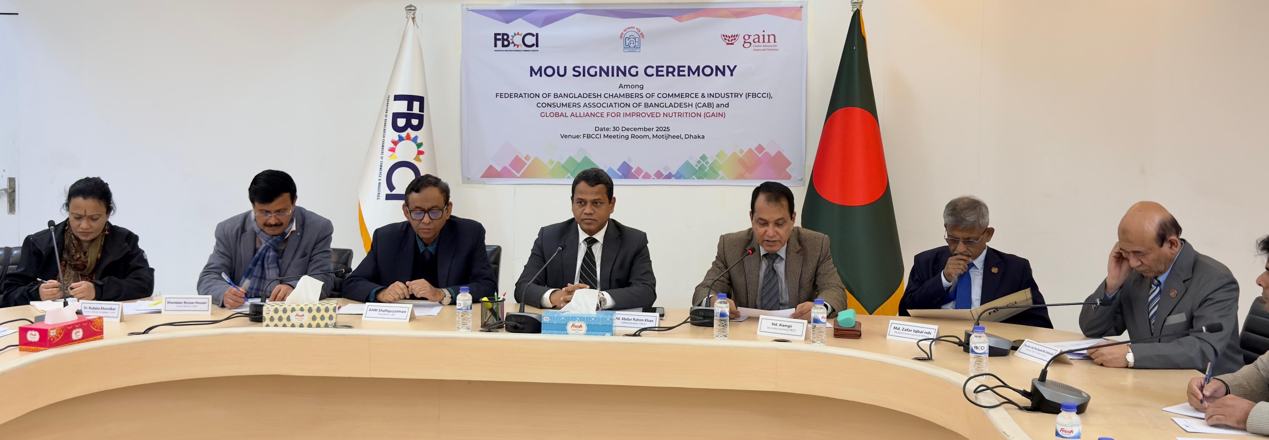 In a major step toward securing the health of the nation’s workforce, a tripartite Memorandum of Understanding (MoU) was signed among the Federation of Bangladesh Chambers of Commerce and Industry (FBCCI), the Global Alliance for Improved Nutrition (GAIN), and the Consumers Association of Bangladesh (CAB). The agreement, signed on 30 December, 2025 at the FBCCI meeting room in the capital, aims to transform food systems within the industrial and commercial sectors to ensure that workers have access to safe, nutritious, and affordable food. The MoU was formally signed by Mr. Md. Abdur Rahim Khan, Administrator of FBCCI; Mr. AHM Shafiquzzaman, President of CAB; and Dr. Rudaba Khondker, Country Director of GAIN Bangladesh. The success of this mission relies on a coordinated strategy where GAIN serves as the technical lead by providing evidence-based models, training, and nutrient gap analysis; FBCCI acts as the industry catalyst by leveraging its extensive private-sector network to integrate nutrition into corporate policy and factory operations; and CAB functions as the consumer watchdog, ensuring food safety, rigorous price monitoring, and the protection of workers' rights to quality nutrition. Furthermore, the partnership is dedicated to creating a supportive environment that ensures the production of safe and nutritious food within the food manufacturing sector.